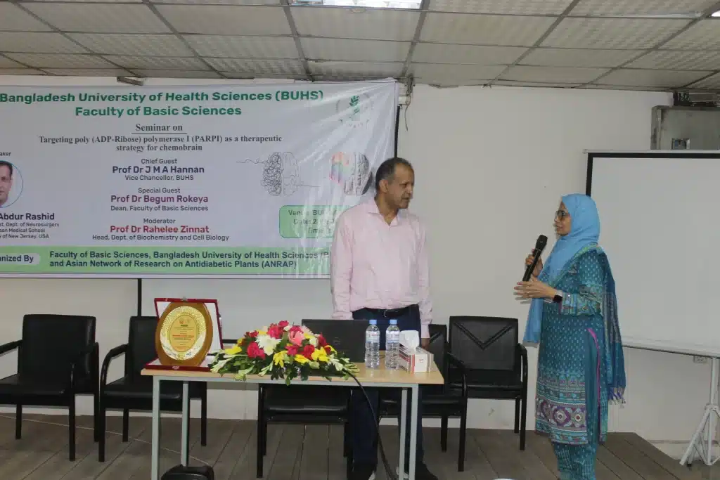Mohammad Abdur Rashid, Senior Research Scientist, Dept. of Neurosurgery, Robert Wood Johnson Medical School, The State University of New Jersey, USA visited Bangladesh from 28 July 2025 to discuss various activities of ANRAP. A seminar was organized by Faculty of Basic Sciences, Bangladesh University of Health Sciences (BUHS) and Asian Network of Research on Antidiabetic Plants (ANRAP) on 28 July 2025. Mohammad Abdur Rashid delivered a lecture on “Targeting poly (ADP-Ribose) polymerase I (PARPI) as a therapeutic strategy for chemobrain”. 100 participants were attended from BUHS in the Seminar.